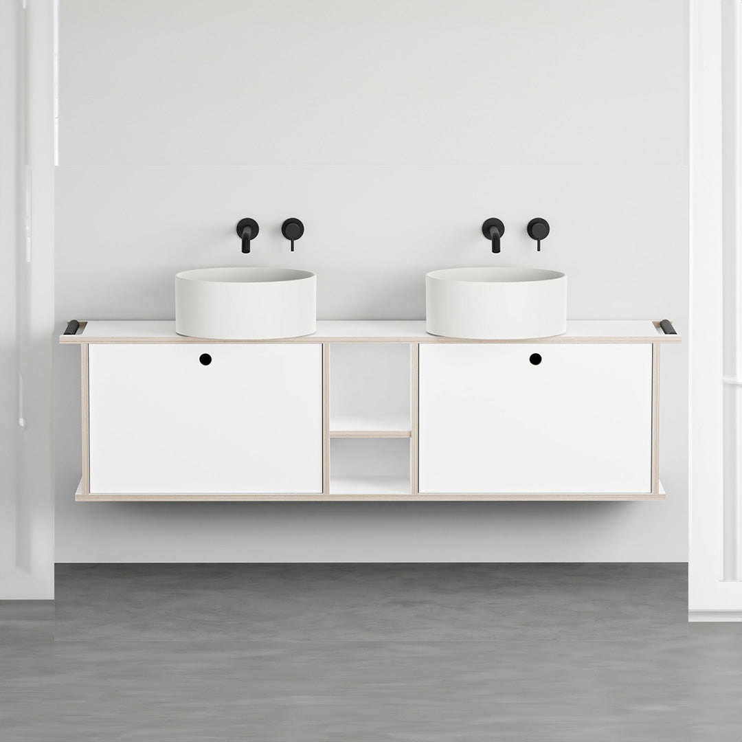 Inspiriran pokretom De Stijl, jednim od najutjecajnijih u modernoj umjetnosti, projekt predlaže oblike nastale iz potrage za apsolutnom jednostavnošću, u kojima kompozicija nikada nije kruta, već bogata grafičkom snagom. U igri vizualnih ravnoteža sastavljenih od ravnina, linija i boja, Theo postavlja novu formalnu gramatiku u kojoj boja i dizajn ostaju glavni protagonisti. Nova kolekcija sastoji se od nekoliko elemenata - velikog keramičkog umivaonika, Fenix ormara na višeslojnoj šperploči s vidljivim rubovima i cjevastih elemenata - koji se kombiniraju kako bi stvorili višestruke konfiguracije. Theo 175 s 2 vrata i otvorenim pretincem.