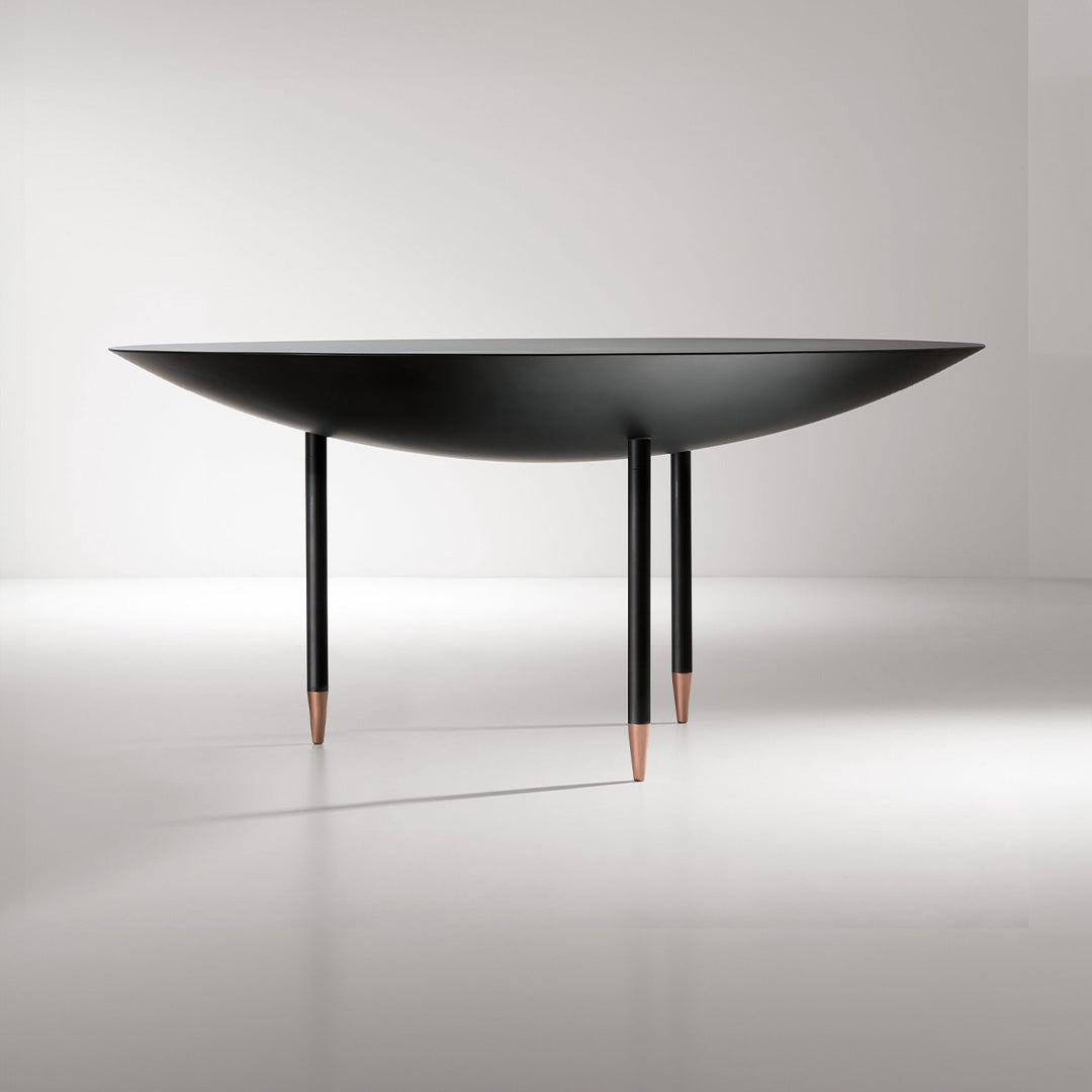 Okrugli metalni stol karakterističan po zakrivljenoj bazi i metalnim nogama koje su u kontrastu sa strukturom. Namijenjen za unutarnju upotrebu.