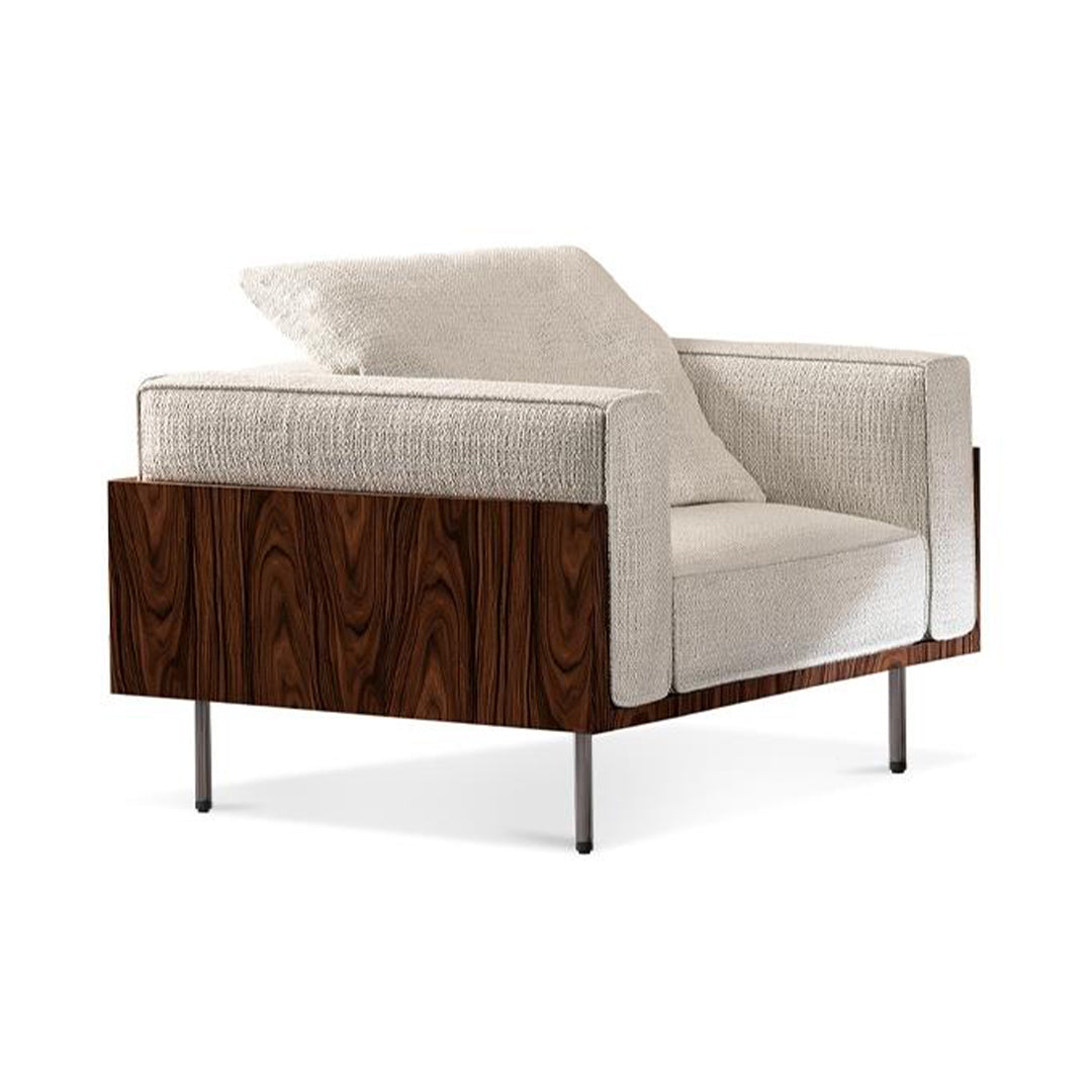 Izrađena od višeslojne iverice. Ispuna sjedišta sastoji se od poliuretanske pjene visoke elastičnosti i promjenjive gustoće, s dodatnim slojem Memory Foam pjene. Metalno sjedalo s elastičnim trakama visokog udjela gume osigurava udobnost i otpornost na deformacije. Rukonasloni i nasloni za leđa obloženi su debelim slojem prošivenih vlakana laminiranih s bijelom hipoalergenom pamučnom tkaninom radi dodatne mekoće i udobnosti. Tapecirani dio obuhvaćen je drvenim okvirom od furnira palisander Santos, bajcanog u tamnosmeđu s mat poliesterskom lakiranom završnom obradom. Neki elementi izrađeni su djelomično od letvica u Canaletto orahu, također bajcanih i lakiranih u mat finišu.