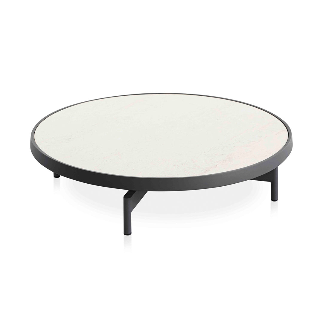 Okrugli niski stolić ONDE Ø90×22 dizajnerski je stolić s bazom izrađenom od zavarenog aluminija s praškastim premazom, na koju je postavljena ploča od izuzetno otpornog materijala Dekton® by Cosentino. Promjer i visina ovog vanjskog stola iznose Ø90 cm i 22 cm – idealne dimenzije za kombiniranje s sofama i lounge foteljom iz kolekcije ONDE, ali i za samostalnu upotrebu.