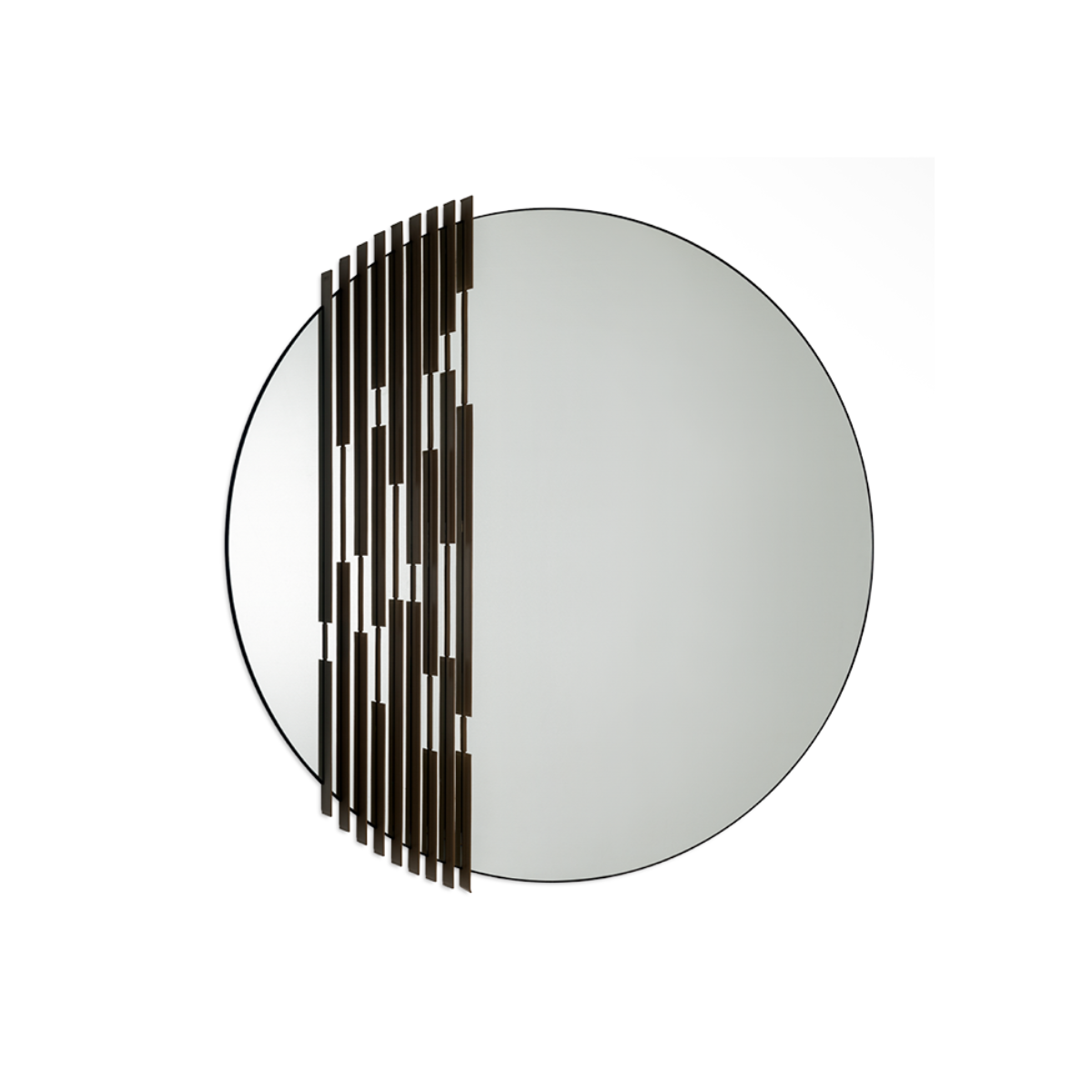 Zidno ogledalo s okvirom od pepeljastog drva u antracit sivoj boji, ukrašeno detaljima od kože u dvije boje ili obojanim brončanim pločicama, čini ga dragocjenim dekorativnim elementom u svakom interijeru.