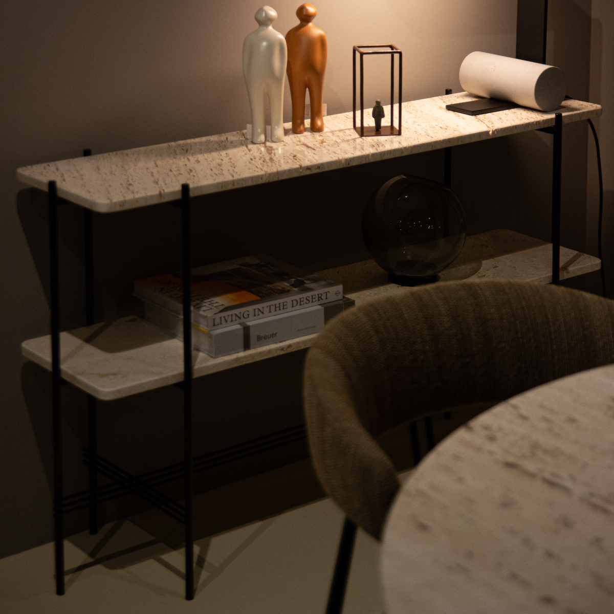 TS konzola, dizajn studija GamFratesi, odlikuje se skulpturalnom estetikom, profinjenim linijama i prepoznatljivim ukriženim nogama. S pločom u kontrastnom materijalu, ova pravokutna konzola funkcionalna je kao poslužna površina.