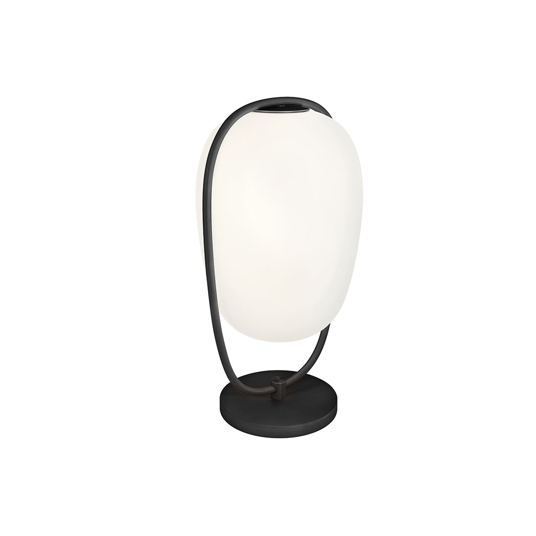 Stolna svjetiljka s opalnim difuzorom izrađenim od dva sloja puhanog stakla. Struktura obložena metalnim premazom.