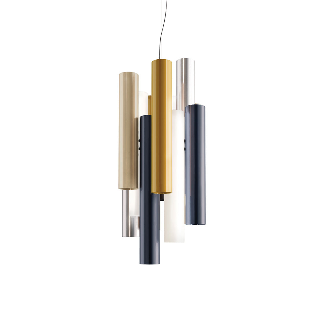 Atmosfera šezdesetih susreće suvremeni ritam. Trodimenzionalni elementi raspoređeni na različitim visinama stvaraju igru svjetla i pokreta. Viseći model objedinjuje dinamiku i dramatičan izgled. Originalan dekorativni element snažnog vizualnog dojma, koji unosi dodatni stil u zajedničke prostore i interijere doma. Viseća svjetiljka. Difuzori od obojenog ili satiniranog pleksiglasa. Konstrukcija s metaliziranim premazom.