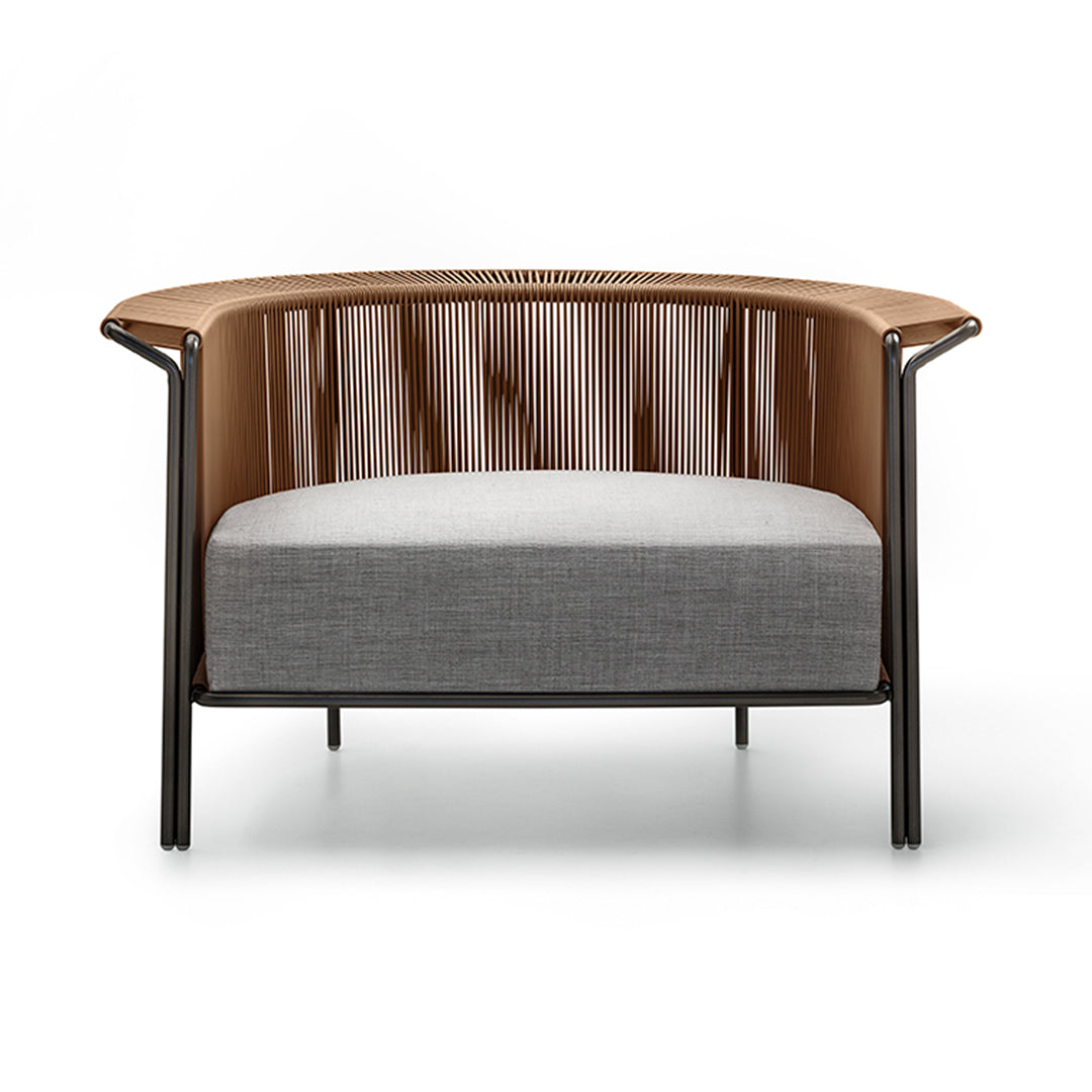 Naslonjač Alton Davida Lopeza Quincocesa ima hrabar, skulpturalan karakter stvoren svojom polukružnom metalnom strukturom, koja prilagođava čiste linije naslona, izrađenog ručno od preko 200 metara starog prirodnog konopca od kože. Također dostupan s naslonom od tamnosmeđeg voskanog pamučnog konopca.