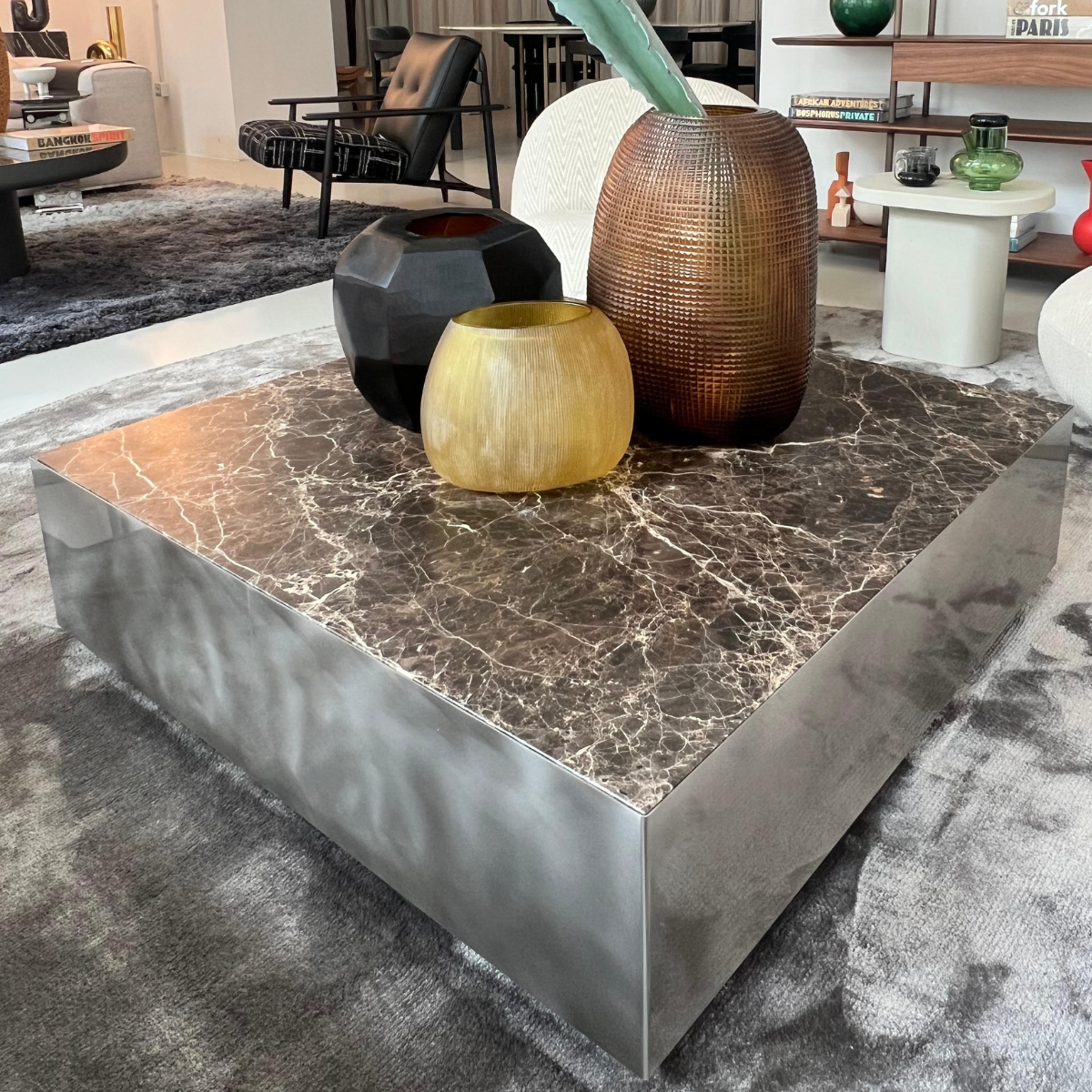 Stolić s plohom od emperador mramora i oblogom od metala odlikuje se profinjenim, suvremenim dizajnom. Kombinacija prozirne, elegantne površine i čvrstog metalnog okvira daje mu lagan, ali istodobno izrazito luksuzan karakter. Idealan je kao središnji element dnevnog boravka ili dopuna uz sofu, unoseći dozu sofisticiranosti i modernog stila u prostor.