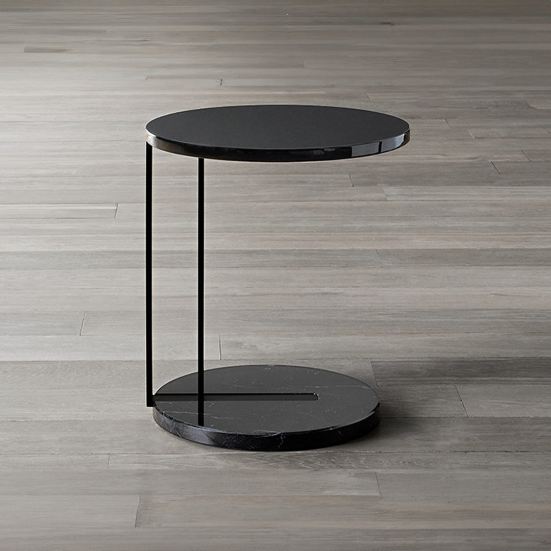 Dragocjena igra ravnoteže i geometrijskih referenci definira izgled ovih niskih stolića: dva okrugla diska – jedan određuje ploču, drugi bazu – spojeni su laganim okvirom od dvije ravne linije u metalu lakiranom u brončani mesing, platinasti čelik ili mat crnu.