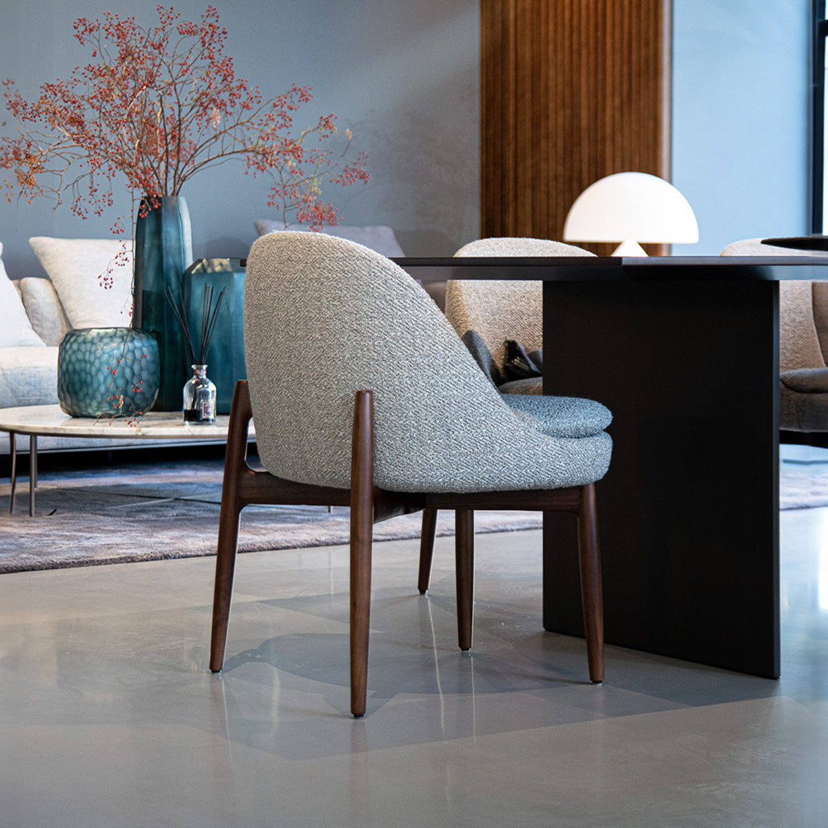 Sendai stolica spaja eleganciju i udobnost u kompaktnom obliku. Obavijajuće tapecirano sjedište počiva na vitkim nogama od punog jasena, stvarajući dojam lakoće i profinjenosti.