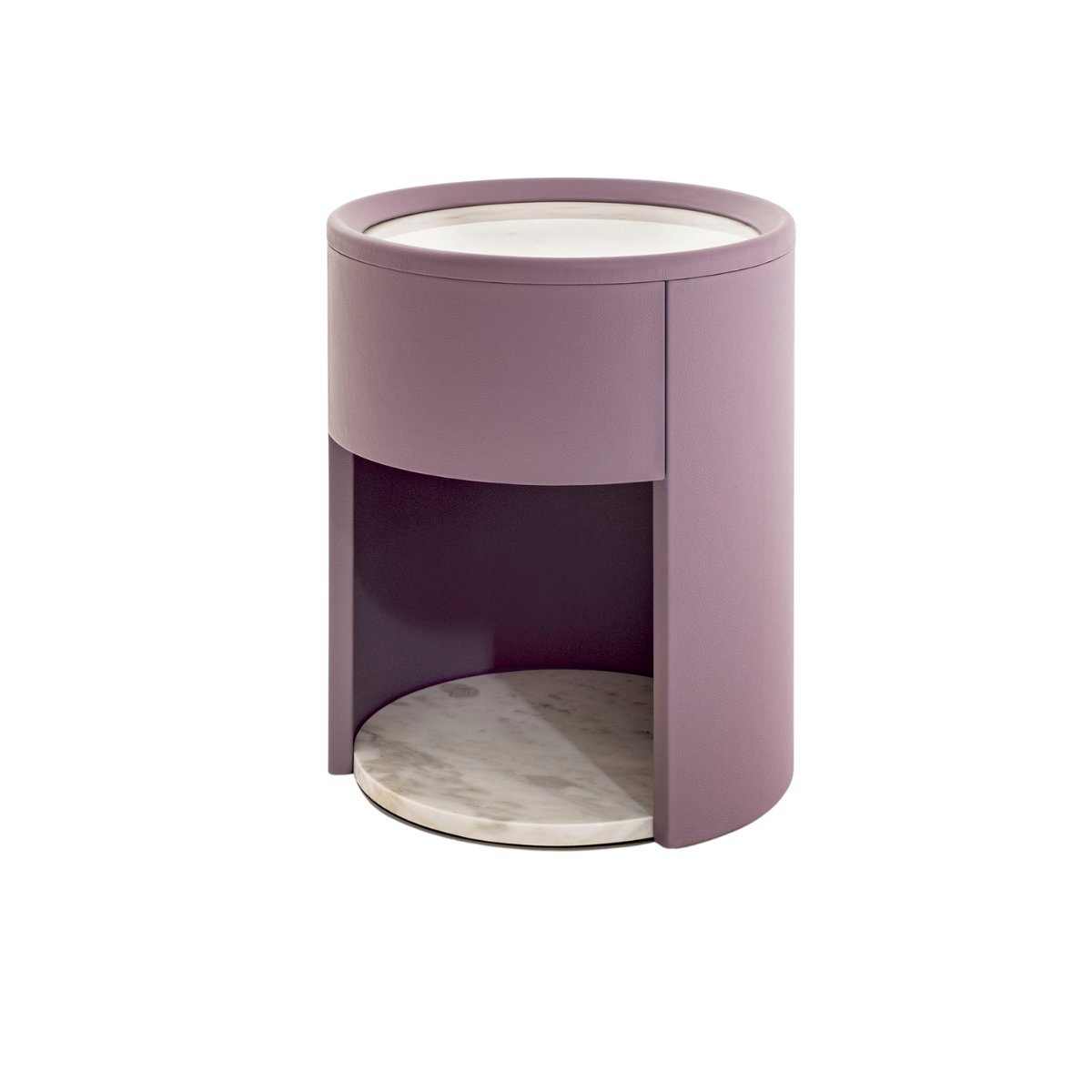 Elegantni i jednostavni noćni ormarić čistih linija. Konstrukcija je izrađena od zakrivljene šperploče obložene kožom, dok su gornja i donja ploča dostupne u mramoru ili drvu oraha Canaletto, pružajući profinjen spoj materijala i funkcionalnosti.