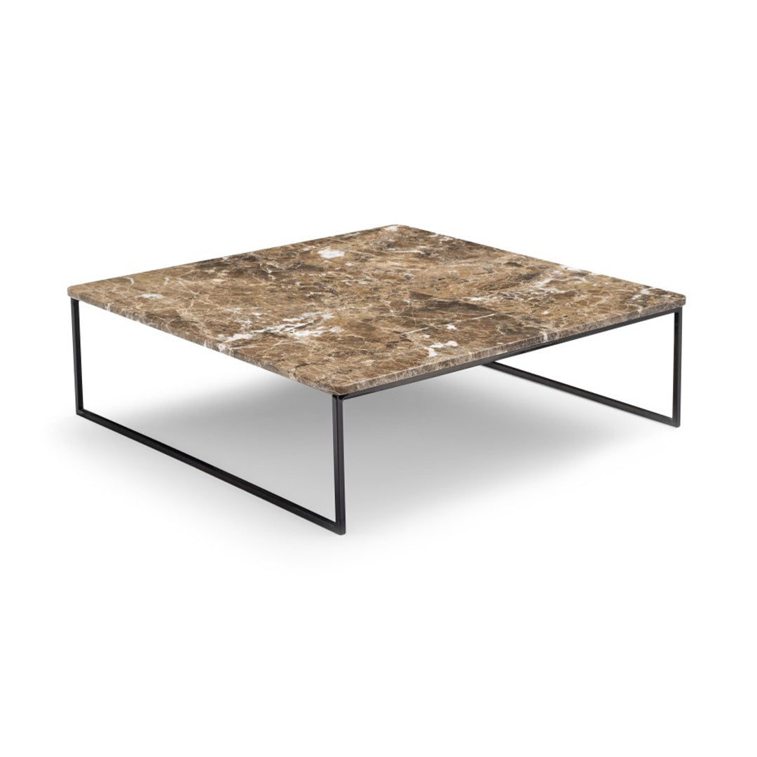 Metrico is a low coffee table, of generous proportions and square in shape. The metal structure in gunmetal supports the table top, available in Emperador or white Carrara marble, or a version in printed glass decorated with an exclusive Nicoline design.