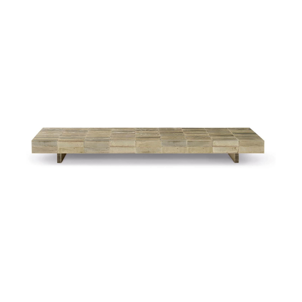 Svi bridovi stolića obloženi su pločicama, s fugama koje dodatno naglašavaju njegovu ručnu izradu i čine ga idealnim za vanjske prostore. Dolazi s brončano lakiranim aluminijskim nogama i u više dimenzija, dok prizmatična verzija ima aluminijski gornji dio u tamnosmeđoj boji, čime dobiva dodatnu vizualnu snagu.