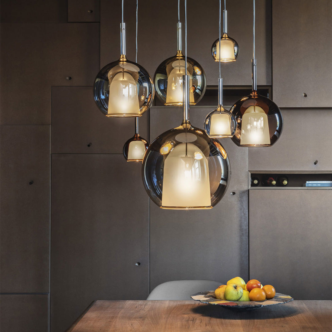 Svjetiljke s kromiranom metalnom strukturom i borosilikatnim staklom. Unutarnje sjenilo je pjeskareno.