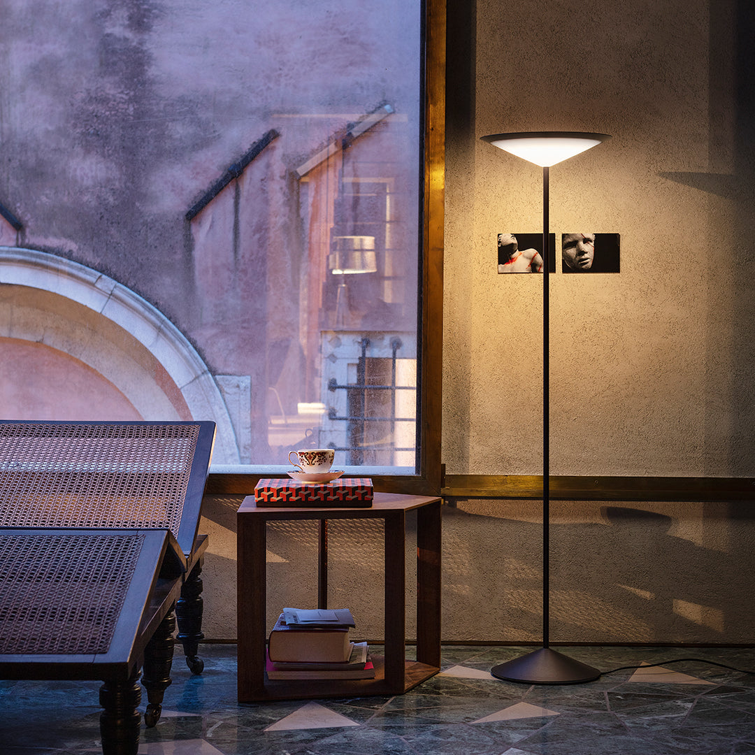 Podna lampa s minimalističkom metalnom strukturom, dostupna u mat finišima koji dodatno naglašavaju njezinu elegantnu i suvremenu siluetu. Idealan dodatak za ambijente koji traže profinjenu, ali nenametljivu rasvjetu.
