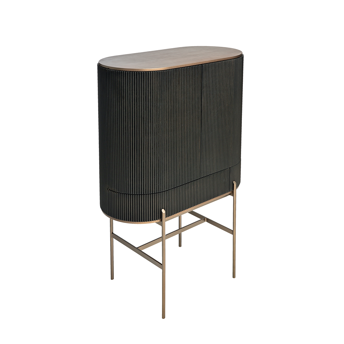 T150 noir, gornja i donja ploča u svijetloj brončanoj boji, polica od ekstraclear stakla, mesingani elementi, metalne noge u svijetloj brončanoj boji