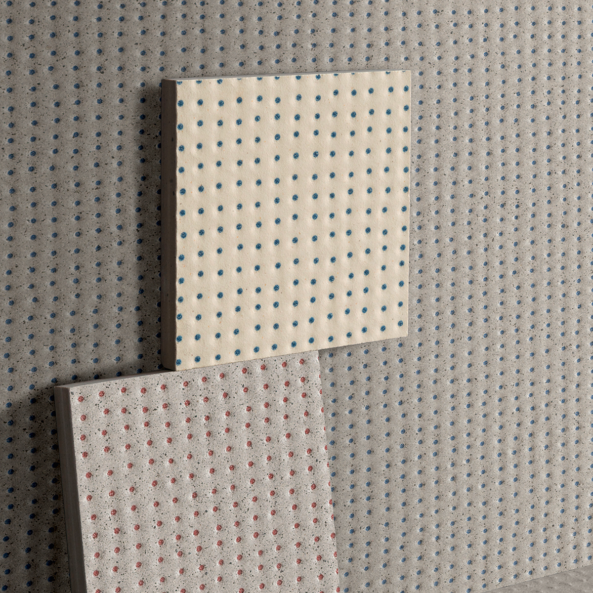 SPECIFICATIONS: – 4 base colors: Blanc, Gris, Argile, Satin – 2 relief and bas-relief 1,5 mm dotted textures (UP and DOWN) – Mixed color tones clay to achieve a materic and natural feeling – Silk-screen decoration (no digital printing) with perfectly centered color dots – Continua technology pressing process after decoration
