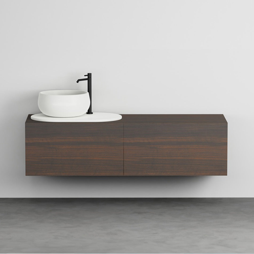 DESCRIPTION: Characterised by an elegance that loves the combination of rigorous and symmetrical lines and soft shapes, Delfo expresses itself with the power of the materials, in a game of combinations between ceramics and wood, that gives life to different interpretations of a single model, united by the same aesthetic vision and the same ability to re-read the ceramic material in a contemporary way. Delfo 76, even more versatile. Even with its small size, Delfo maintains its elegance and its functionality. Dry and essential, in the new 76 cm version it enhances even the smallest spaces without sacrificing its storage capacity. The wooden chest of drawers, which can be chosen in a variety of lacquers or wooden finishes, retains its own capacity and brings a cosy and functional atmosphere to every bathroom. The formal purity of the basin, resting on the oval ceramic countertop, conveys the charm and practicality of this noble material. With new possibilities for colour combinations, modulating the two elements in the glossy or matt shades of “Acque” and “Terre di Cielo".