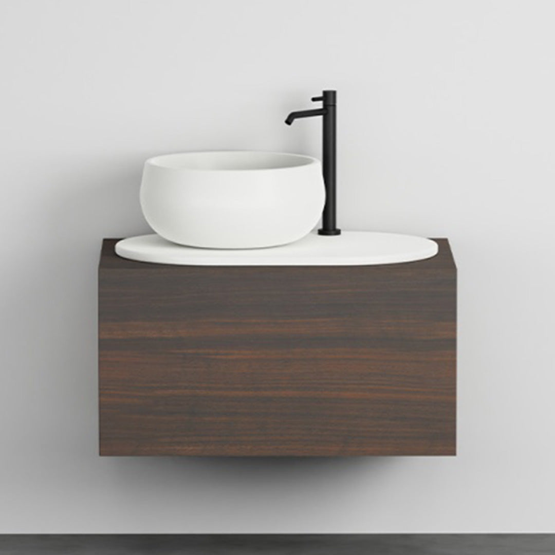 DESCRIPTION: Characterised by an elegance that loves the combination of rigorous and symmetrical lines and soft shapes, Delfo expresses itself with the power of the materials, in a game of combinations between ceramics and wood, that gives life to different interpretations of a single model, united by the same aesthetic vision and the same ability to re-read the ceramic material in a contemporary way. Delfo 76, even more versatile. Even with its small size, Delfo maintains its elegance and its functionality. Dry and essential, in the new 76 cm version it enhances even the smallest spaces without sacrificing its storage capacity. The wooden chest of drawers, which can be chosen in a variety of lacquers or wooden finishes, retains its own capacity and brings a cosy and functional atmosphere to every bathroom. The formal purity of the basin, resting on the oval ceramic countertop, conveys the charm and practicality of this noble material. With new possibilities for colour combinations, modulating the two elements in the glossy or matt shades of “Acque” and “Terre di Cielo" .