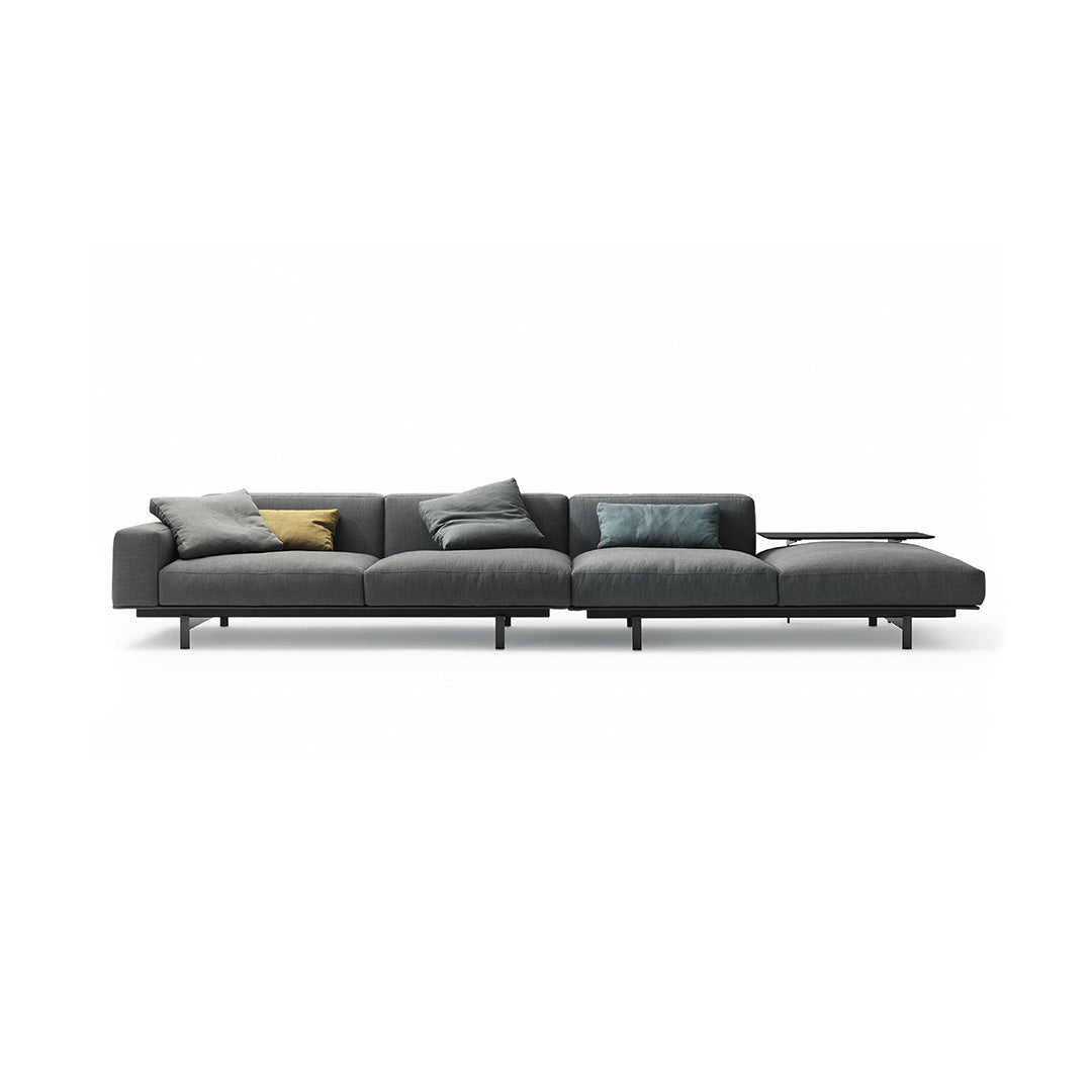 The concept of the sofa as a furniture system comes to life in this design by Francesco Rota, who combines modular upholstered elements with Lema’s trademark containers. The collection - which reinterprets some of the creative styles typical of the industrial design of the 1960s - is the product of a desire to find common ground with the world of systems: the upholstered sections integrate with surfaces, shelves, side tables and containers which come together in different combinations to creation unique multifunctional compositions. The structure, made from fabric-covered metal, is a flat surface resting on feet secured with triangular cross-section joints. This, in turn, provides the base for the cushions and armrests, which simply rest on top of the structure without concealing it, thus celebrating the material contrast at the heart of this piece. The structure also provides support for the shelves and containers. Completing the collection is an elegant daybed, which is also available in a stunning leather version.