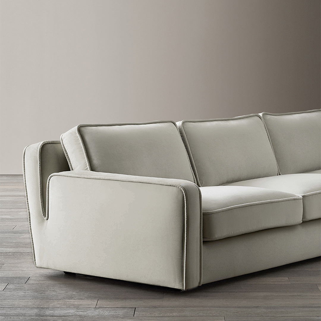 A sophisticated, contemporary reinterpretation of classic, elegant sofas: this collection is characterized by the diagonal cut of the frame which separates seat and backrest. A rich piping on the cushions defines the shapes, while the generous depth evokes a feeling of “home” and absolute comfort.