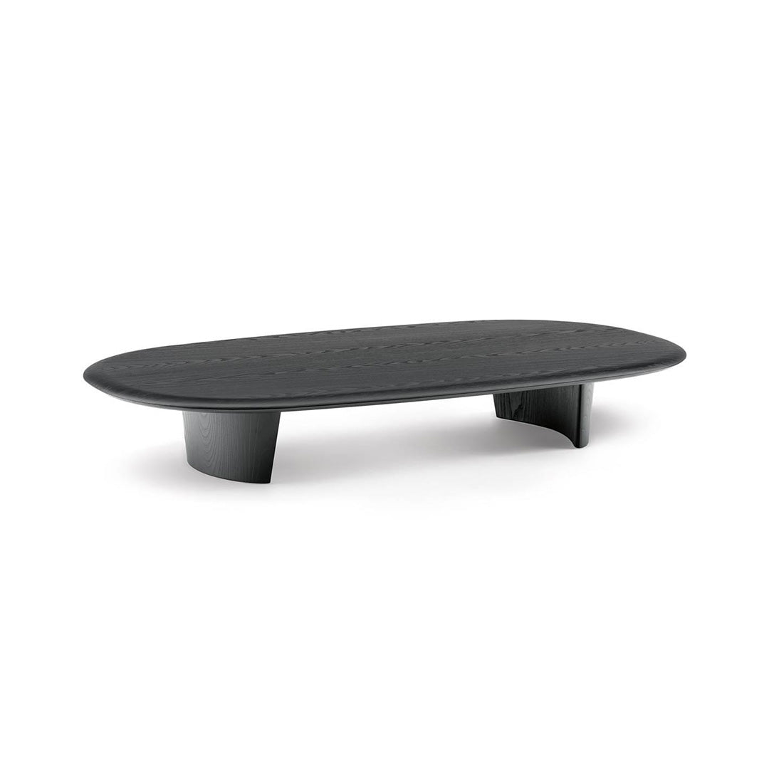 The circular or elliptical Licorice coloured ash top has edges smoothed like a river pebble, the result of in-depth technological research, and rests on the characteristic polished Chrome or Pewter metal base. The large coffee table for the centre of the lounge, on the other hand, is proposed in a single-material solid wood version, with the top resting on two curved bases, crafted with exquisite manufacturing skill. The possibility of combining coffee tables of different heights allows Anish Wood to interpret the new ways of contemporary living with a high degree of versatility.