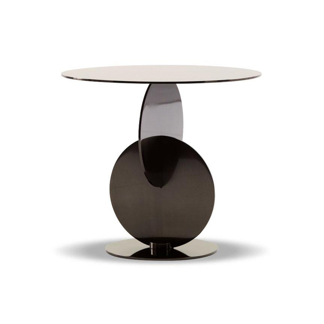 It looks like custom-built pieces, rather than mass-produced items. Sophisticated coffee table with laser-cut, black-nickel finished discs assembled by cross welding.