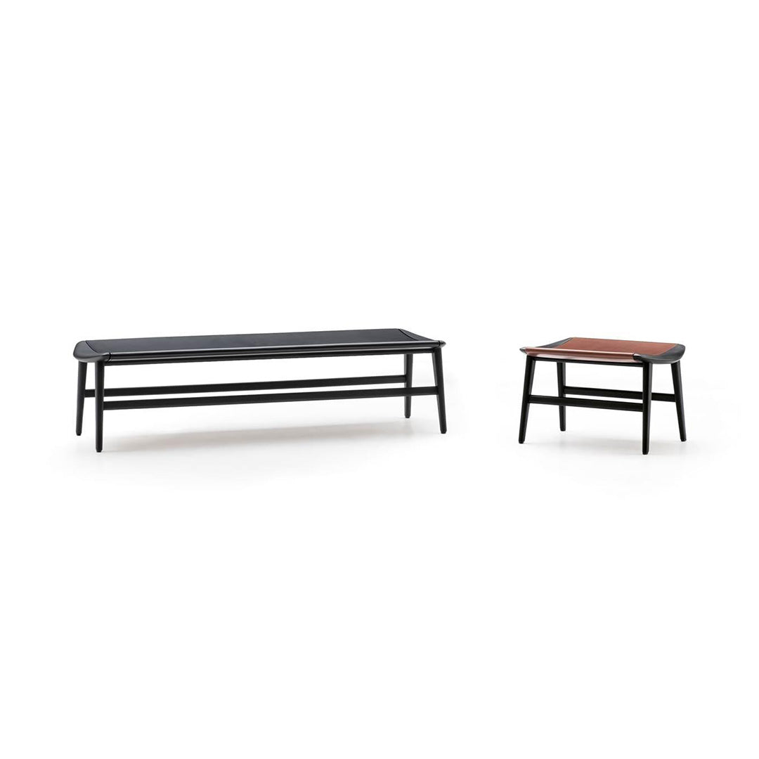 The Fynn family of seats is completed by a footstool and some benches of different sizes, all with a cushion except for the benches in the Saddle-Hide version, which have a structure with a slightly concave top, combined with a saddle-hide covering that envelopes it like exquisite leather.