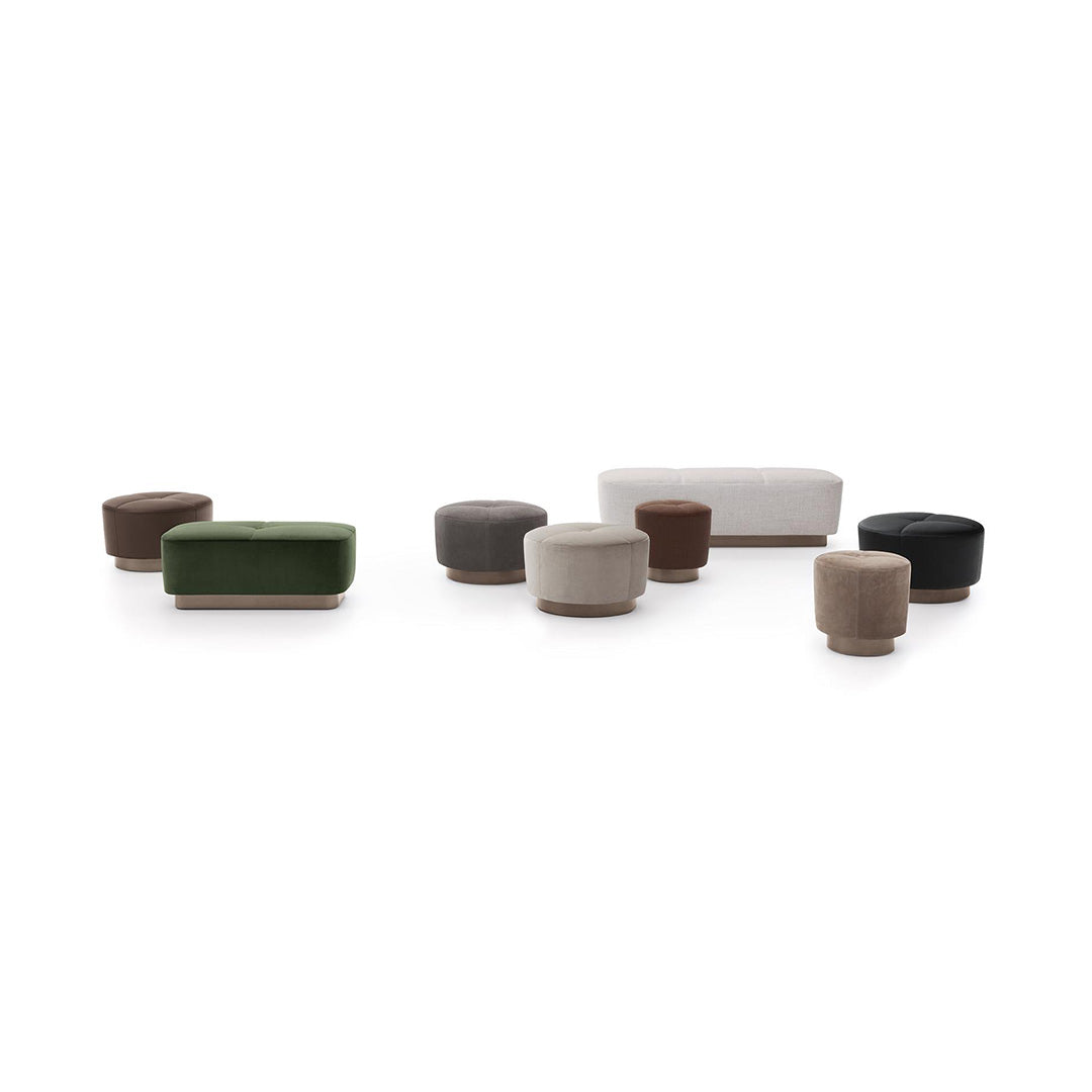 When combined with its ottoman and the Song coffee table that embraces the armchair with its organic shape, it becomes a functional table-top surface for a lamp or to display various kinds of objects. The extensive Jacques family also includes ottomans in various shapes and sizes, all distinguished by an elegant stitched motif and a square decorative button. The metal base with Bronze finish is a detail that lends refined decorative appeal to each piece in the Jacques collection.