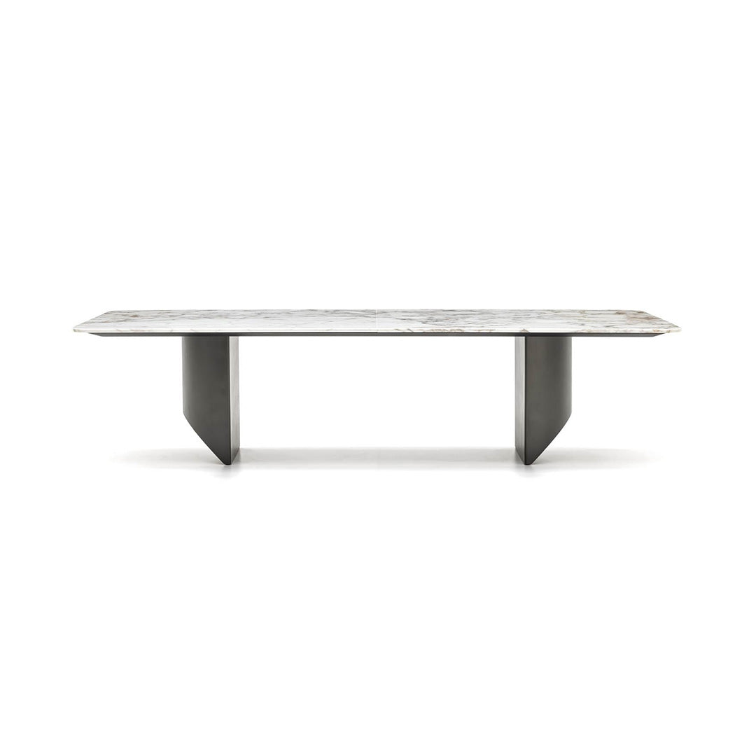 The entire volume of the table, hosting the large top, appears to become weightless and leans