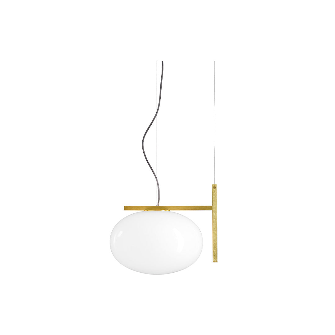 Suspension lamp giving diffused light in polished opaline blown-glass. Satin brass or anodic bronze finish structure with rectangular profile.