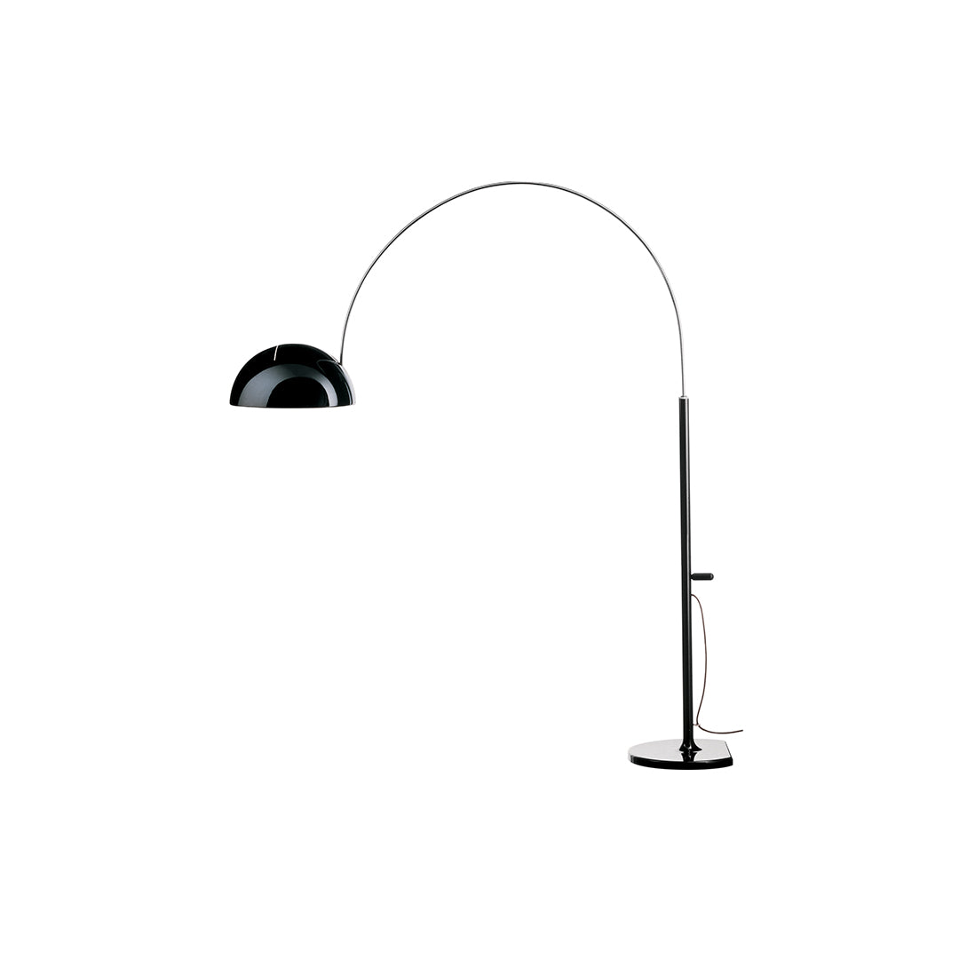 The Coupé series, designed by Joe Colombo, was initially conceived as a variation of the Spider family, created by the same designer, of which it has kept its base and stem. The simple, ingenious mechanism that connects the stem to the head makes it possible to direct the beam in several directions, by moving the dome up, down and sideways. In 1968, Coupé won the ”International Design Award” of the American Institute of Interior Designers in Chicago. It is part of the permanent collection at both the MoMA in New York and the ”Neue Sammlung” Museum in Munich. Available in two versions, with either a semi- cylindrical or a semi spherical dome, over the years, many models of Coupé have been created (ranging between the historic table lamp to the floor and wall lamps), becoming one of the most renowned and appreciated Oluce collections. Floor lamp giving direct light, metal lacquered base and structure, revolving and height adjustable chromium plated arc, lacquered aluminium reflector.