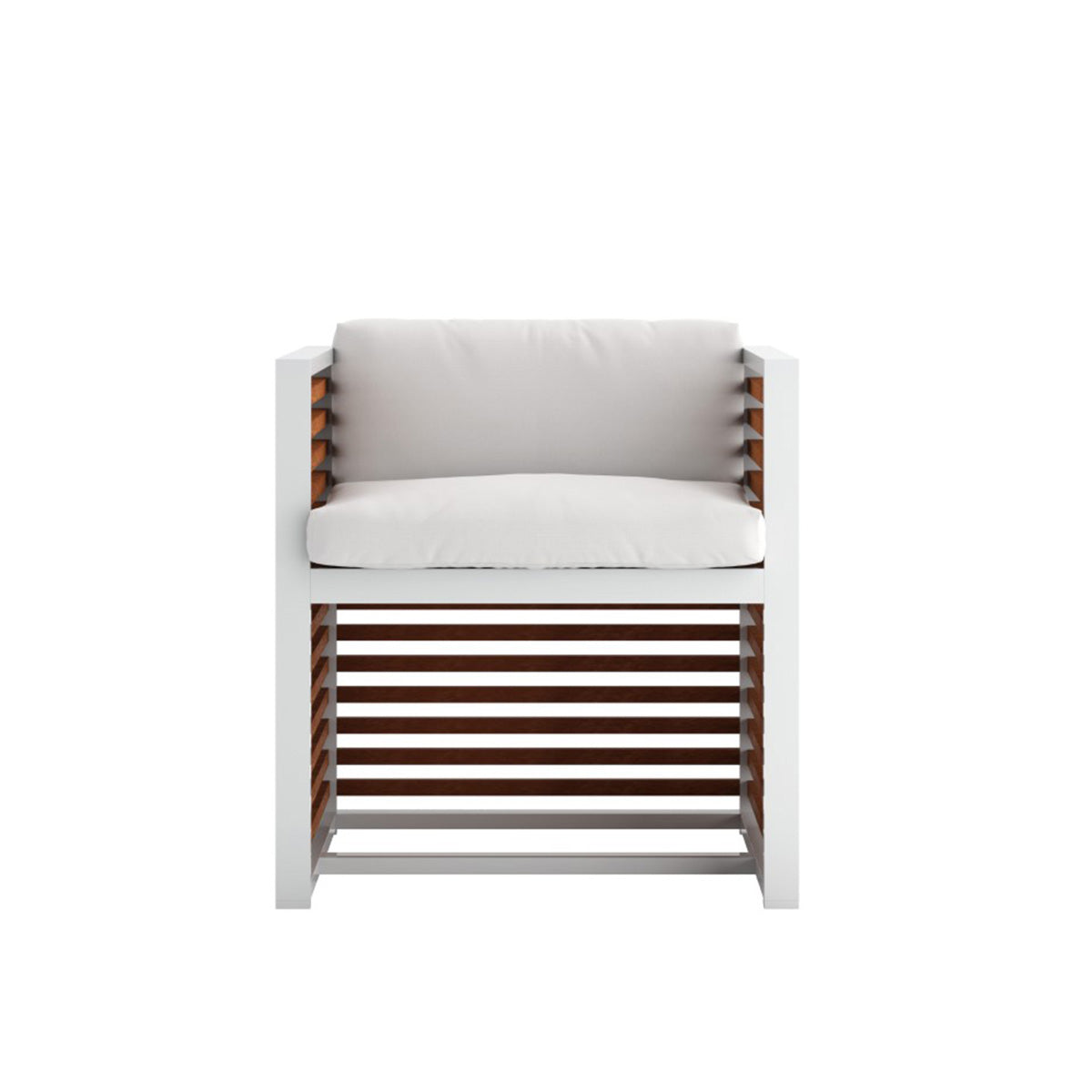 DNA TEAK is the most purist outdoor furniture collection designed by José A. Gandía Blasco Canales for GANDIABLASCO. A contemporary construction concept made entirely with machined aluminium profiles and teak wood slats, which expresses the designer’s lifestyle and his passion for the autochthonous Mediterranean architecture, as well as the work of some contemporary architects who use wooden slats in their designs. The DNA TEAK armchair completes the collection. It is a designer armchair formed by a welded aluminium frame structure with slats of tropical wood resistant to water and weather elements. Comfort resides in the cushion, filled with polyurethane foam rubber and wrapped with water-repellent fabric. The upholstery is made with special outdoor fabrics by Sunbrella, Serge Ferrari, among other textures and colours.