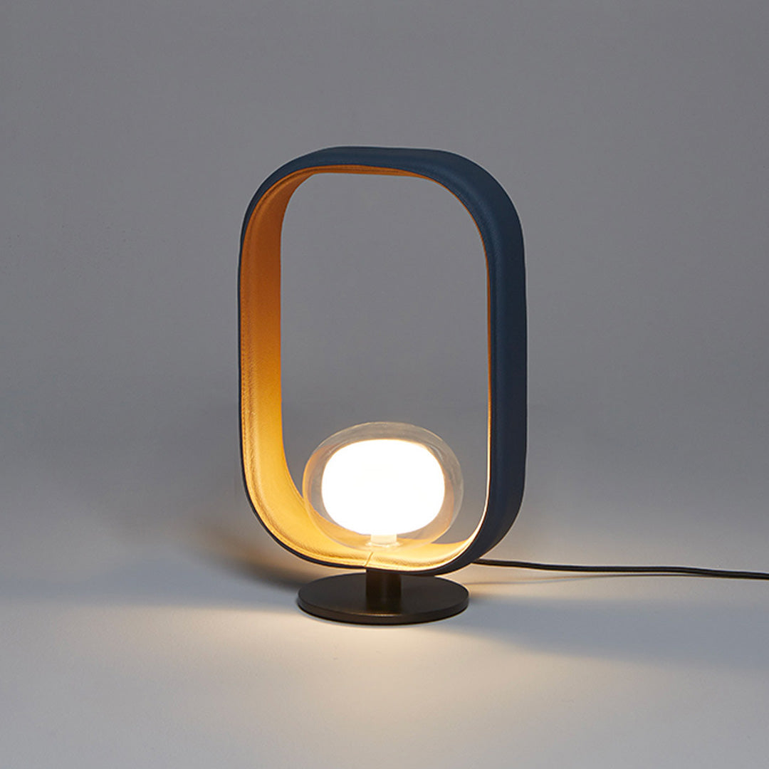 DESCRIPTION: Collection of lamps inspired by the classic Chinese lanterns. The particular bi- dimensional structure is made by powder coated painted metal on the outside, while the inside color is sand gray. A new version in a two-coloured leather has enriched the collection. The light source is located inside a doubleside borosilicate glass diffuser, while the suspensions have an additional integrated LED light source in order to create a direct illumination downwards. Structure made of a circular metal base coated with epoxy powders and a metal bend in epoxy powders coating or in two-tone leather. The light diffuses through a Ø16 cm double wall borosilicate spherical glass diffuser. Integrated dimmer on cable.