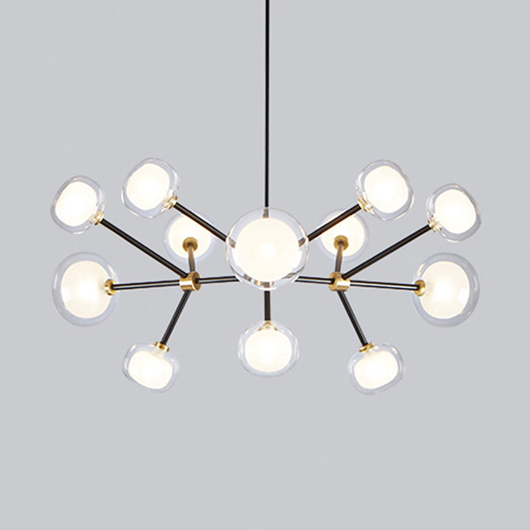 DESCRIPTION: 50s inspired collection of elegant and sophisticated lamps representing the detail to enrich any location. A double-sided spherical bright object in borosilicate glass makes these lamps available in different compositions, with a structure made of metal coated with epoxy powder, enriched with brushed brass or black chrome details. Different varieties are available for any situation: chandeliers (in five different models), table lamps, bedside (smaller), floor, or wall (available in three different models for single or composite personalized installation). Richness and sobriety all in one single element. Structure made of metal painted with epoxy powder and brushed brass or black chrome details. Clear or smoked double-wall borosilicate spherical glasses.