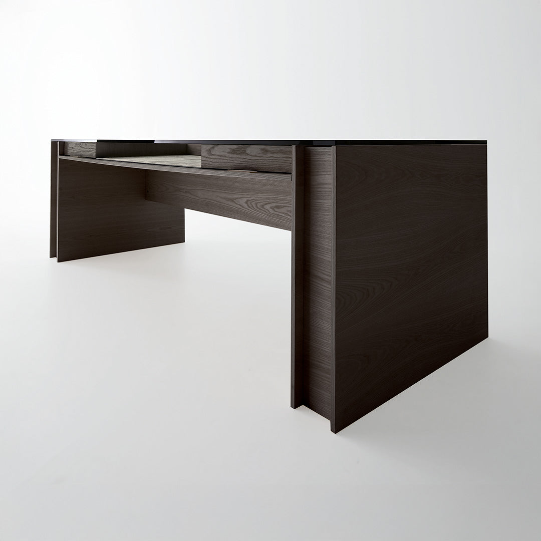 Executive desk with structure and drawers in natural ash, tobacco stained or black lacquered open pore wood. 15mm transparent or extralight glass top. Also available with 12mm smoked “grigio Italia” tempered glass top. Suede or leather writing pad as per- samples.