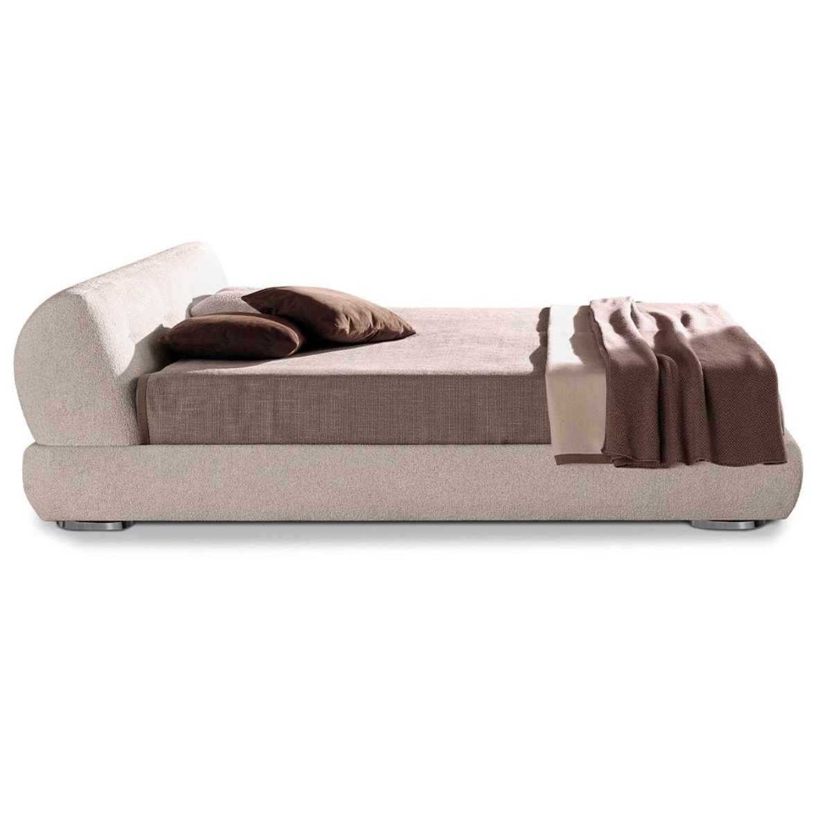Manual skills and a unique tailoring approach define the Edoardo bed. The essentiality of the solid wood frame plays in a game of contrast with the volumes of the headboard available in three versions, each one with its own personality. The first version is enveloping and sophisticated, upholstered with a textile covering and outlined by a piping; the second one is an invitation to relax with its soft, welcoming allure thanks to the flat ruffles; the third version in woven saddle leather shows a rigorous but at the same time glamorous look: the complex weaving process combines the utmost care for details with traditional manufacturing skills.