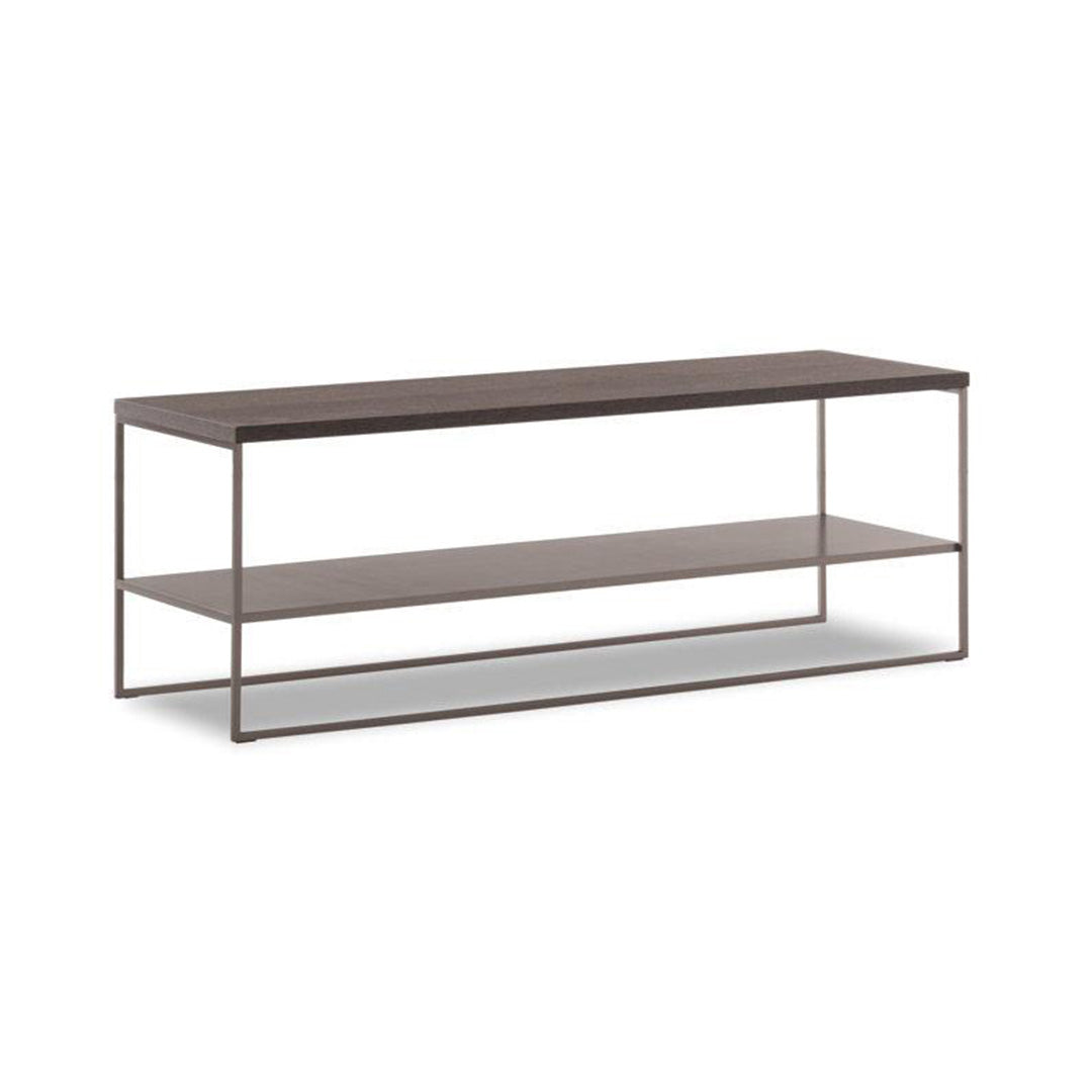 A console with a clean, understated style that comes in a variety of finishes for a multitude of uses in various rooms inside the home. The hand-crafted or matt black solid iron structure can be teamed with the following tops: ebony veneer with a matt or glossy clear polyester finish, natural brushed oak, open pore Grey, Moka or Black tinted oak, lacquered in a variety of refined nuances and Black Marquina marble.
