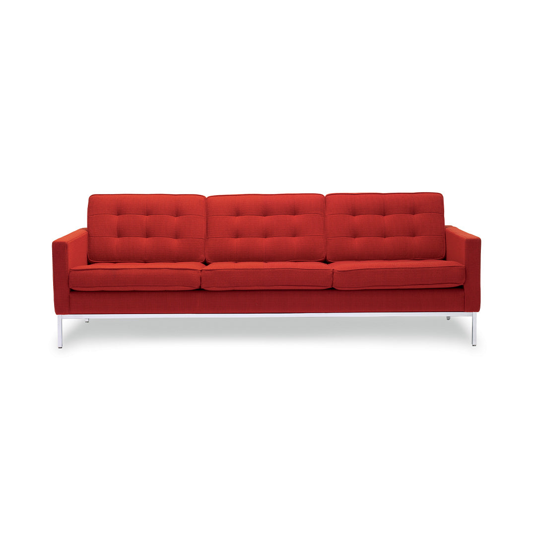 This versatile collection includes a lounge chair, sofa, two-seater bench and three seater bench. The KnollStudio logo and Florence Knoll's signature are stamped into base of each frame, to guarantee authenticity. Construction: Exposed metal frame and legs of heavy gauge tubular steel. Arm, seat, and back cushions are variable density foam, welted, and button tufted. Leather pieces have matching buttons; fabric pieces do not.