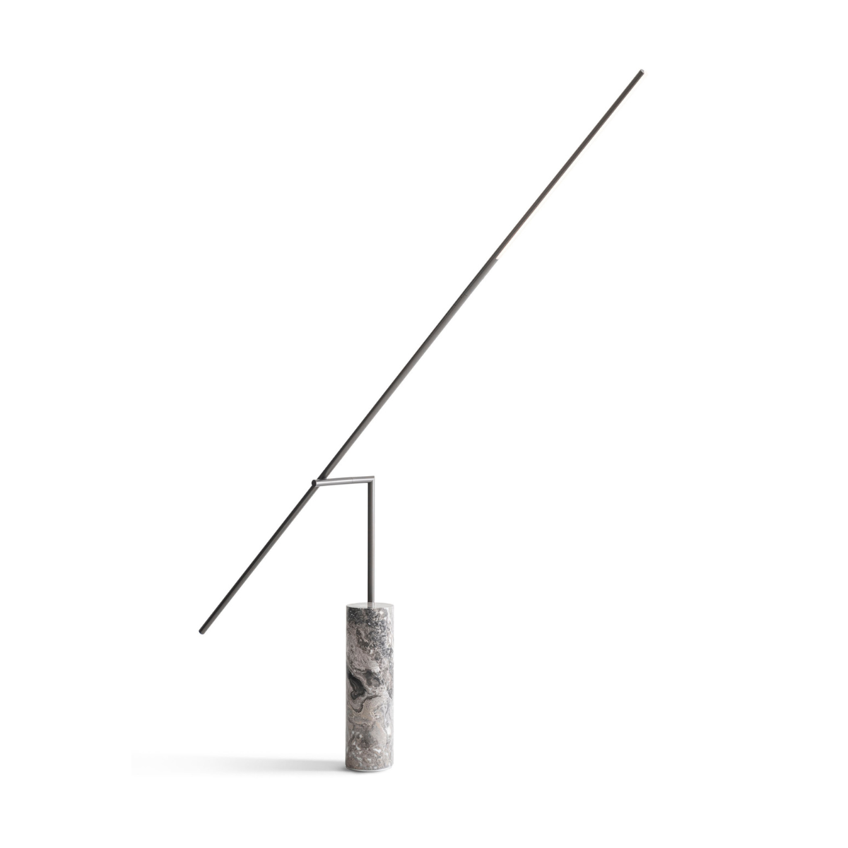 A floor lamp characterized by tangencies and balances capable of bringing light into the space. Marble base and 360° rotatable LED light source, 240 cm tilting arm. The different parts are connected by three magnetic connections, which allows for a wireless electrical connection. The diffuser provides maximum efficiency in illuminating horizontal surfaces. Dimmable and with variable color temperature.