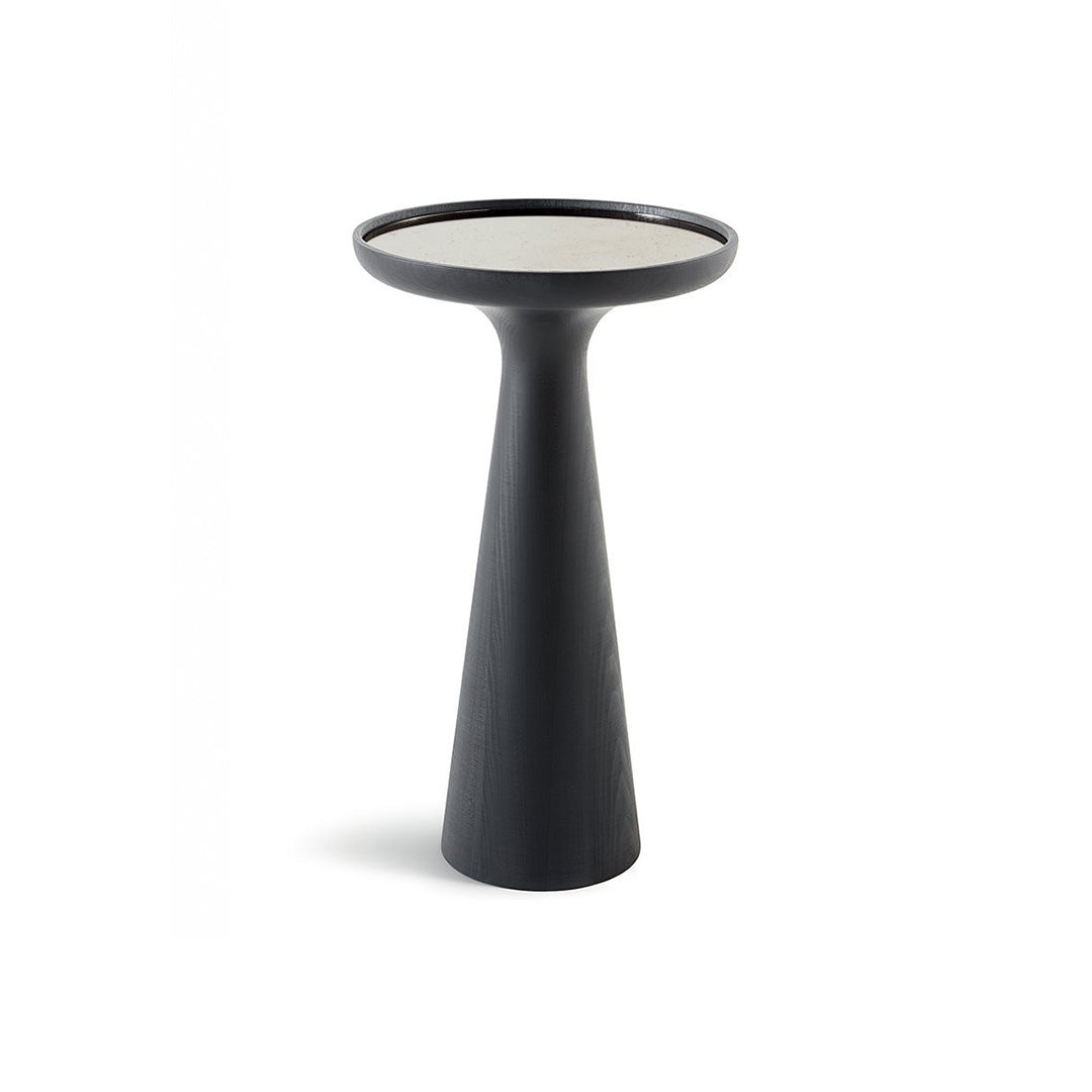 Coffee table made of solid wood painted black with visible pores. Tray made of "Grigio Italia" glass.
