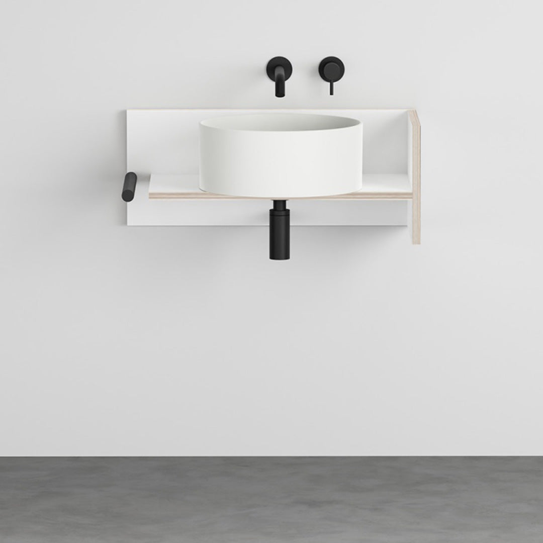 DESCRIPTION: Inspired by the De Stijl movement, one of the most influential in modern art, the project proposes forms born from the search for absolute simplicity, in which the composition is never rigid, but rich in graphic strength. In a game of visual balances made up of planes, lines and colours, Theo dictates a new formal grammar, in which colour and design remain the main protagonists. The new collection consists of several elements - a large ceramic basin, a Fenix cabinet on multilayer plywood with visible edging, and tubular elements - which combine to create multiple configurations. DIMENSIONS: cm 72x38 Modular system for suspended installation
