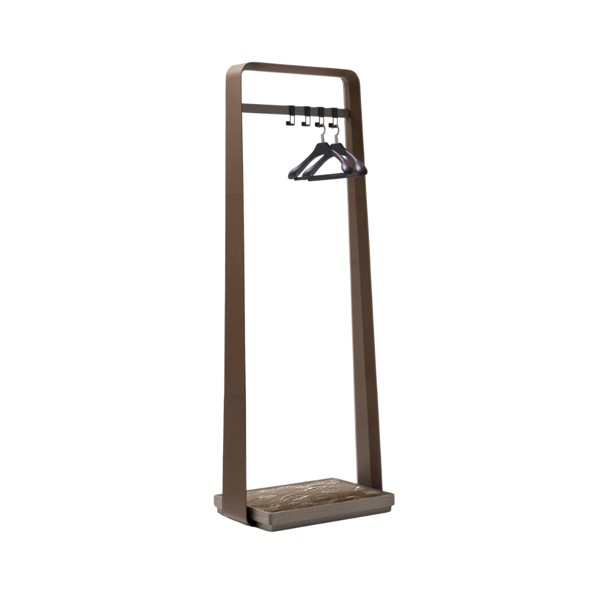 Vješalica Frame spaja drvo,kožu i mramo. Izrađena je od drva javora s bočnim profilom od kože, naglašavajući profinjenu kombinaciju materijala i čistu, arhitektonsku formu.