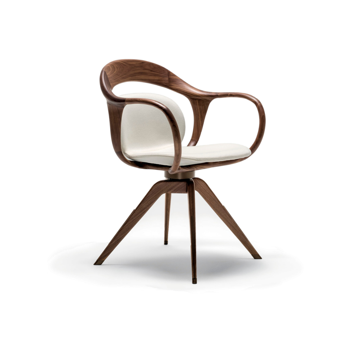 Stolica s okretnim sjedalom, izrađena od masivnog orahova drva Canaletto, s presvlakom od tkanine ili kože. Čiste linije i jednostavnost elementi su koji obilježavaju autentičnost stolice Norah.